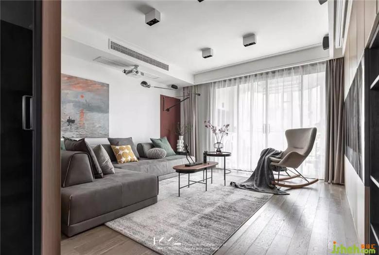 主臥與公共空間統(tǒng)一,裝修公司沿用了木飾面材料,將整個L型飄窗包裹,整體格調(diào)素雅;背景墻選擇了橙紅色裝飾畫點綴,這里也同客廳背景的色調(diào)統(tǒng)一呼應。