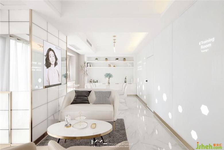 進入主接待廳,首先展現(xiàn)的是一面品牌形象墻,裝修公司運用kd板與亮面不銹鋼的和led水滴形燈柱的結合,將原本枯燥的接待過程以夢幻的氛圍呈現(xiàn)。