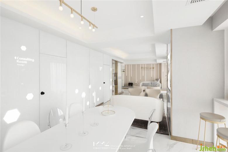 會議區(qū)與接待區(qū)合并在一起,裝修公司將室外美景利用落地玻璃窗引到室內,室內外無過渡的融合,客戶在體驗的同時,我們的技師在這里開會研討,空間的利用更加多元化,超白玻結合整體燈箱照明在這個墻面也是繼續(xù)延用,整體空間更加完整統(tǒng)一。