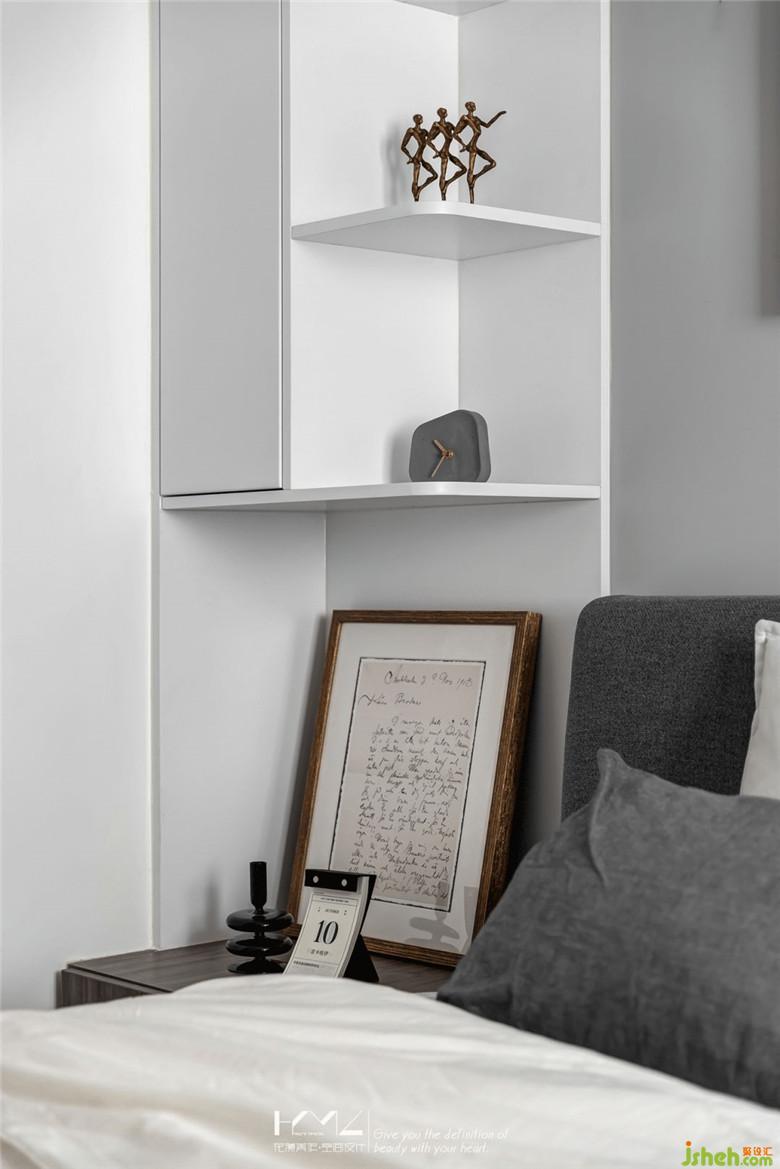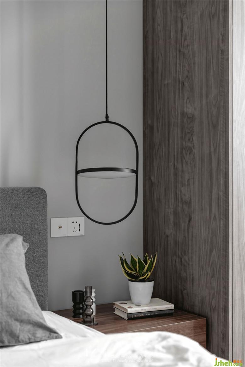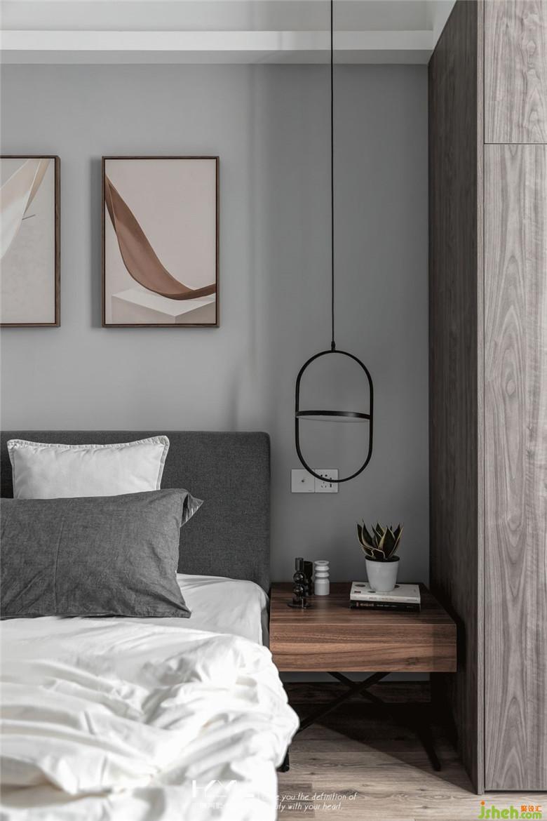 主臥整體格調(diào)偏沉穩(wěn),胡桃木的柜體、深灰色的床體和淺灰色的背景搭配白色的墻面,空間呈現(xiàn)一種簡潔、利落的清爽感,床品和床更是融為一體,素色的紋理更凸現(xiàn)空間的氣質(zhì)。