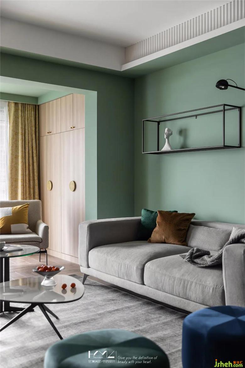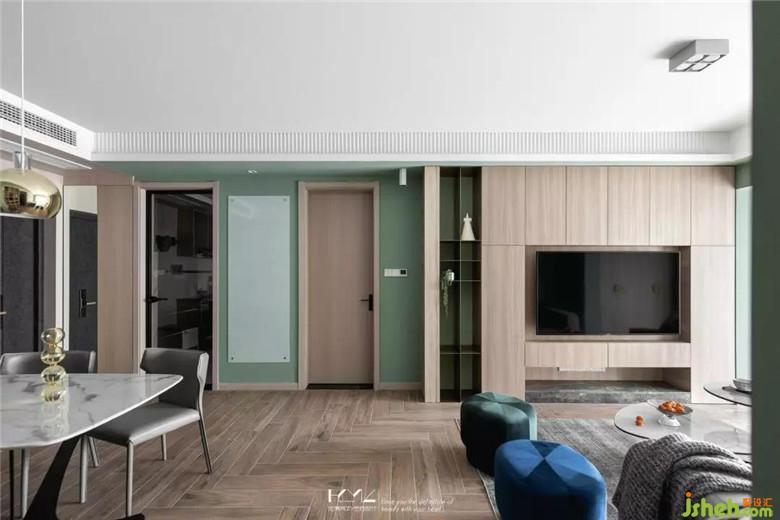 沙發(fā)背景與電視背景,乳膠漆與木飾面大塊面色彩