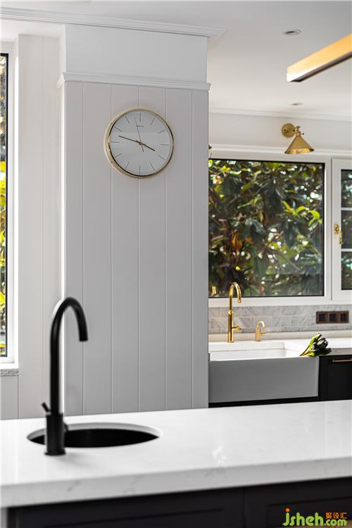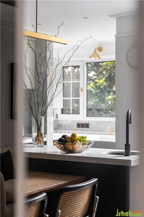餐廳區(qū)域的島臺(tái)與餐桌呈T字型擺放