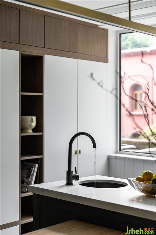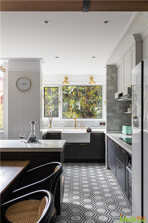 地面采取了六角磚與地板拼接的形式,利于廚房操作空間地面的打理