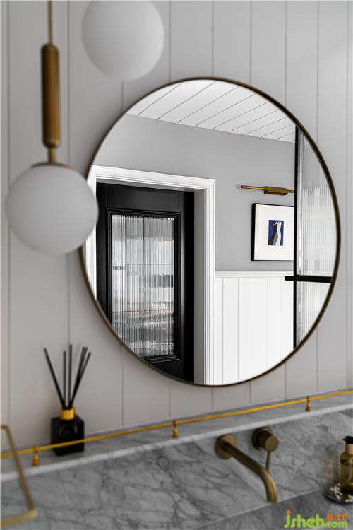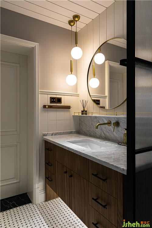 金屬衛(wèi)浴用品與胡桃木色的碰撞使干區(qū)空間盡顯精致