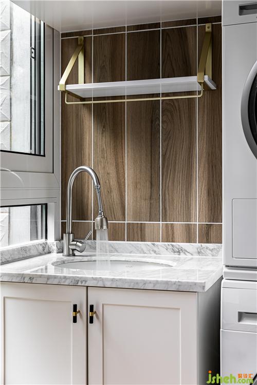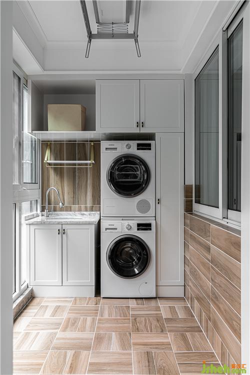 陽臺依然延續(xù)木色系,白色柜門與設(shè)備融為一體