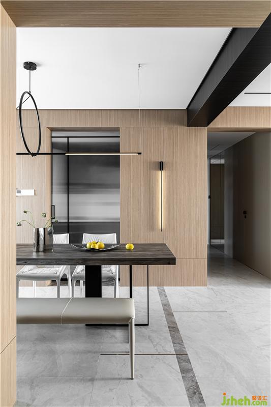 深木飾面包梁,將入戶(hù)與餐廳與過(guò)道三個(gè)區(qū)域進(jìn)行聯(lián)動(dòng),弱化空間邊界感。