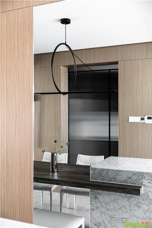 餐桌與島臺(tái)一體順延,高低有致,與吧臺(tái)區(qū)形成圍合聯(lián)動(dòng),擁攬絕佳的視野與采光。