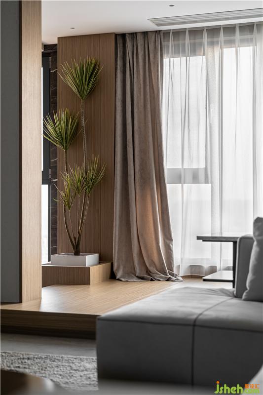 木飾面整體包裹,正面內(nèi)嵌的長條方塊啞光磚,與亮銅壁燈的對稱布局,光影的折射、隱約的紋理,籠罩出一種包容之感,極具視覺張力,暗黑中的優(yōu)雅,更加耐人尋味。