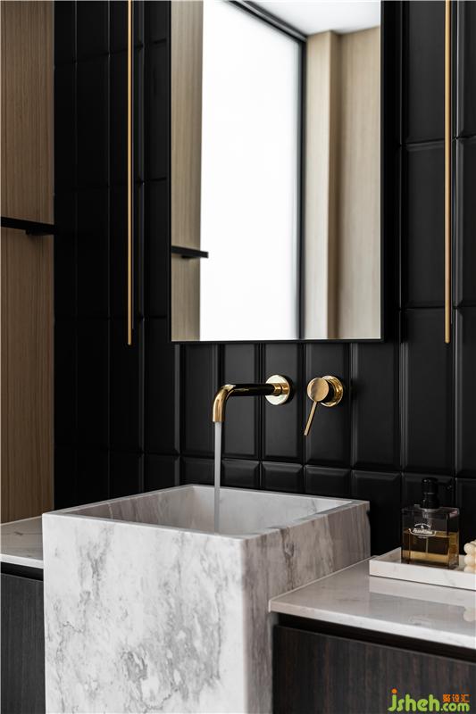 五金件均采用了預(yù)埋手法,石材紋理與黑色五金的材質(zhì)對比,細(xì)膩質(zhì)感延伸至每個(gè)角落.
