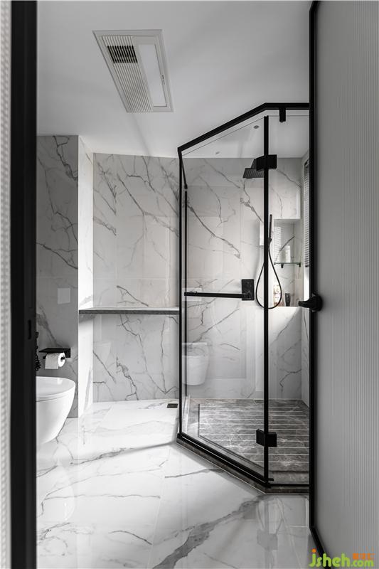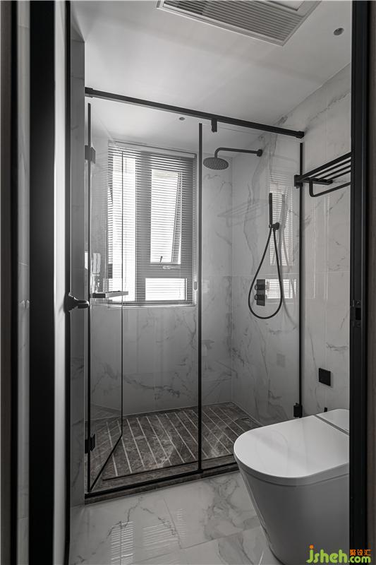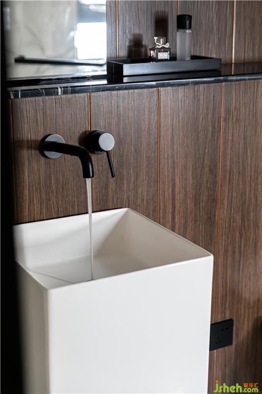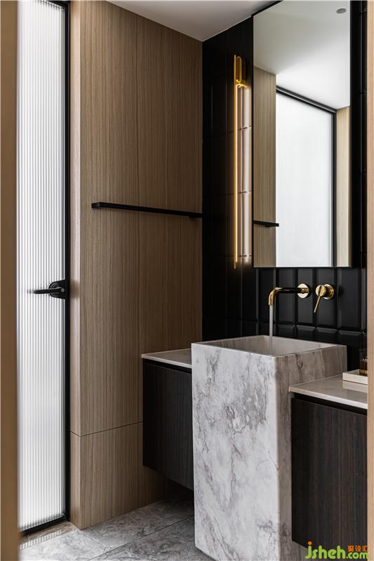 設(shè)計(jì)師同樣注重精準(zhǔn)材料推敲,木紋磚與黑色石材的拼接,立柱盆與墻排馬桶錯(cuò)落布置,無框銀鏡內(nèi)藏了強(qiáng)大的收納功能,門背后預(yù)留了大量的收納區(qū),小空間的立面收納運(yùn)用到極致。