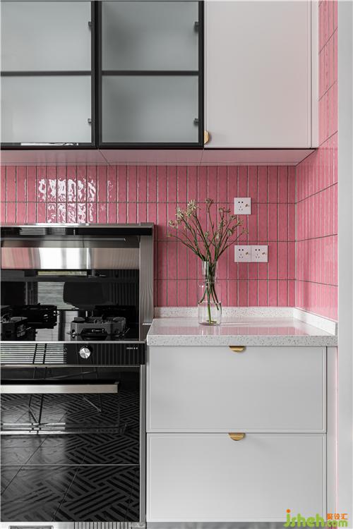 廚房的最大的亮點就是大面積小粉磚的鋪貼,將這個小小的廚房襯的溫馨自然.