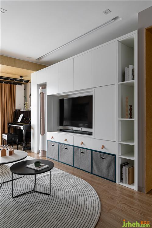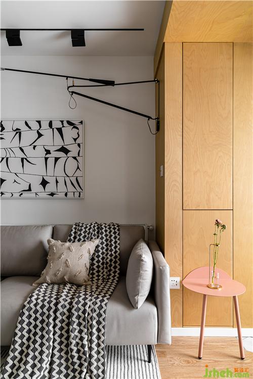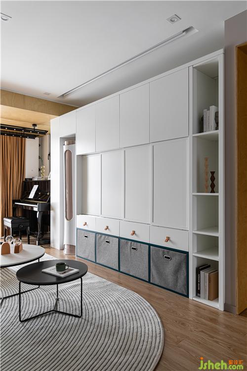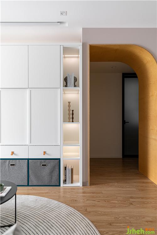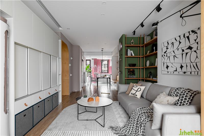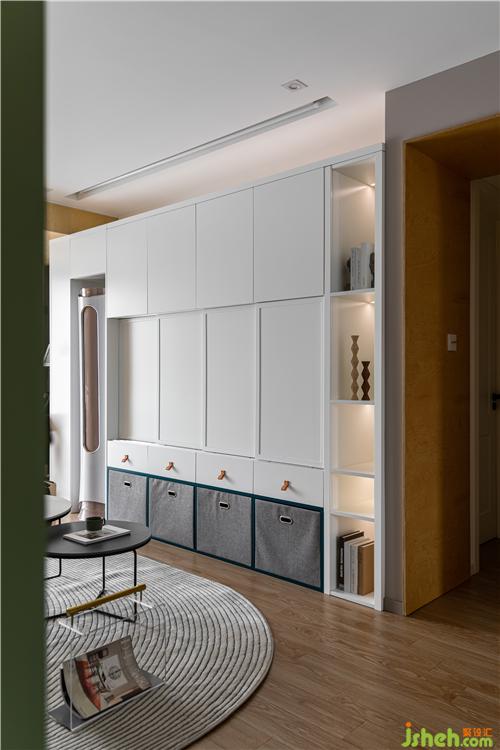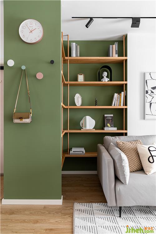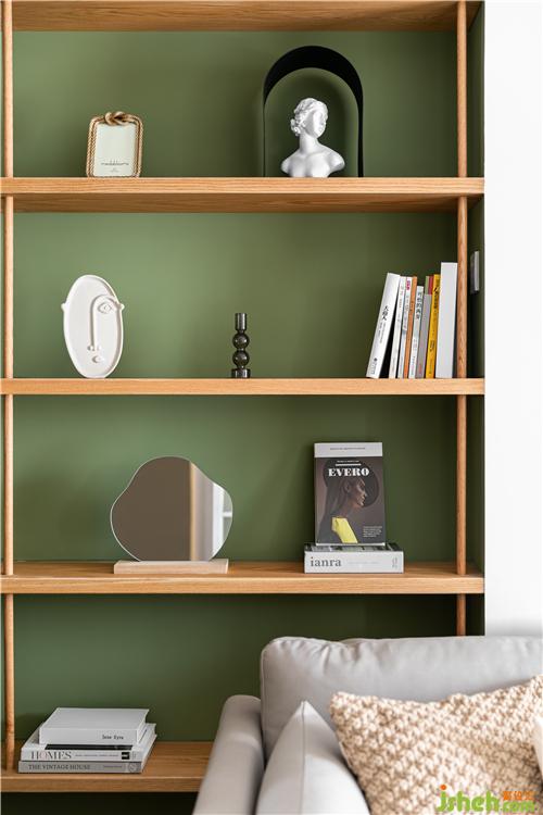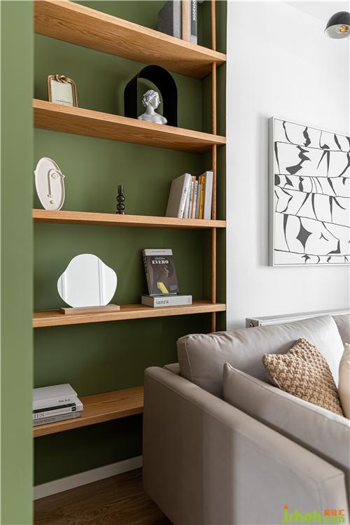 沙發(fā)背后利用空間原始凹陷結(jié)構(gòu),打造一個(gè)開放的陳列區(qū),單獨(dú)跳躍的色彩增加空間的趣味和美觀.