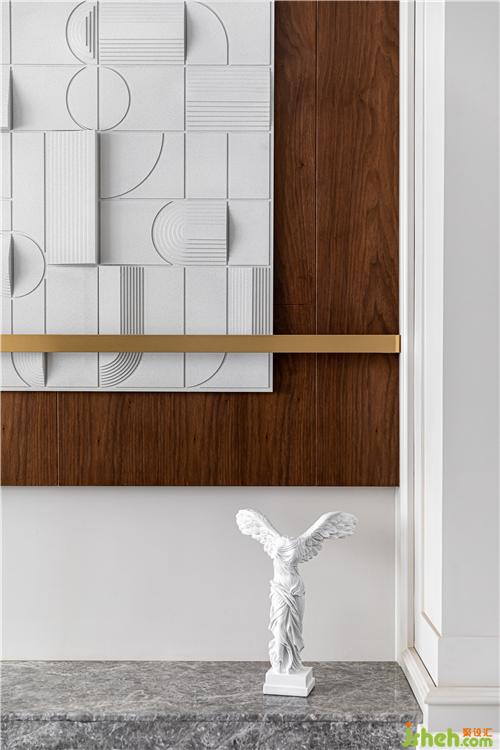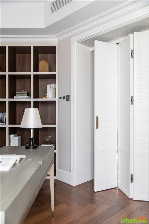 進口斑點圖案壁紙、人字拼地板、陣列排布的書架,呈現(xiàn)出一種秩序之美;書架采用奶油色烤漆封板對胡桃木柜體進行分割, 打破木色的厚重感;窗簾、書桌、書椅以優(yōu)雅的灰色調(diào)為主,營造沉靜復(fù)古的書房氛圍.