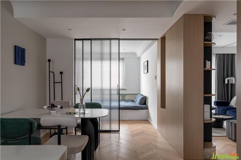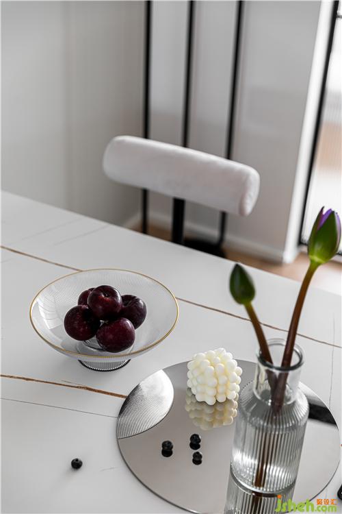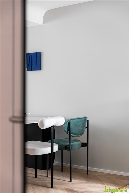 為了弱化建筑結(jié)構(gòu)梁體,吊頂做了弧形處理,增加空間延展性;餐廳位于過(guò)度地帶則沒(méi)有過(guò)多的裝飾,一副藍(lán)色的立體畫(huà)是點(diǎn)睛之筆,在滿足基本就餐需求之余,更多的希望保證這個(gè)空間的互動(dòng)和完整性.