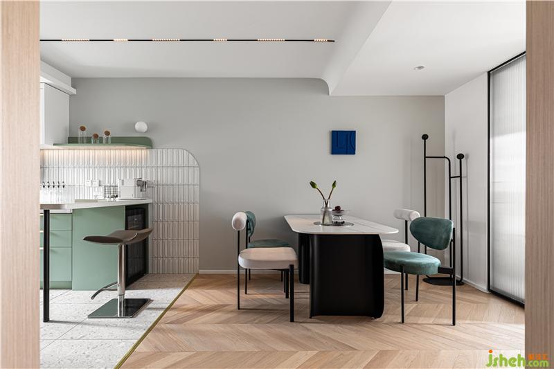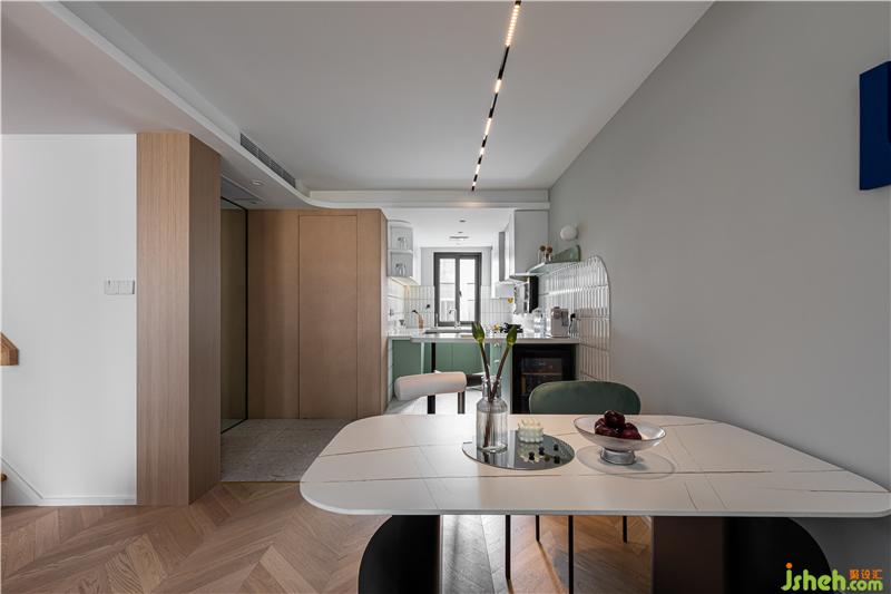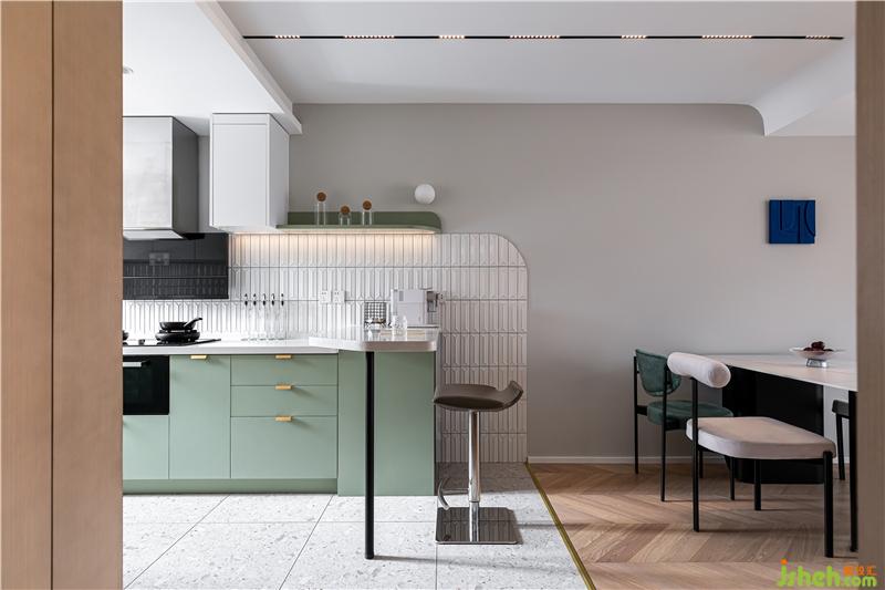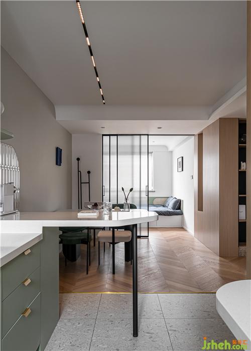 入戶映入眼簾的是廚房吧臺(tái)區(qū),沒(méi)有過(guò)度緩沖,干凈的白色立體磚搭配著灰綠色櫥柜,墻磚轉(zhuǎn)角處做弧形弱化棱角;灰色的水磨石地磚與木質(zhì)的地板碰撞張弛有度,室內(nèi)設(shè)計(jì)師呈現(xiàn)一種歲月靜好的安穩(wěn)和素樸.