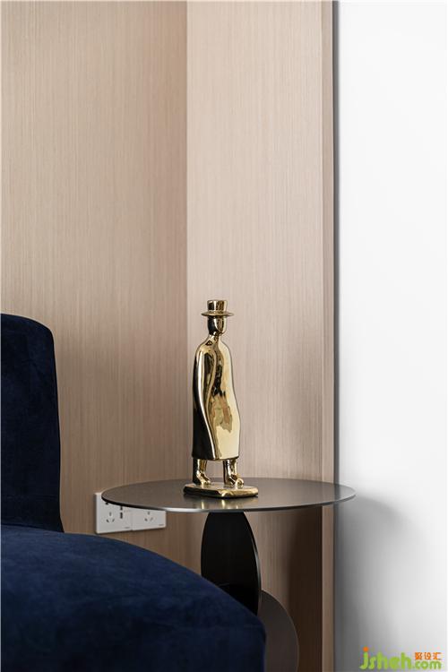 半高的轉(zhuǎn)角木飾面造型搭配干凈利落的燈帶,奠定一種沉穩(wěn)大氣的基調(diào).