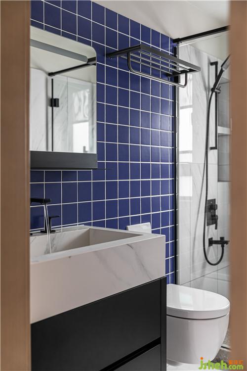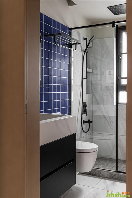 衛(wèi)生間的設(shè)計手法現(xiàn)代又高級,白色的石材磚搭配深藍色方磚,室內(nèi)設(shè)計師沉穩(wěn)的色彩,凸顯出靜謐的氣氛;半高瓷磚鋪貼手法使空間更加立體.