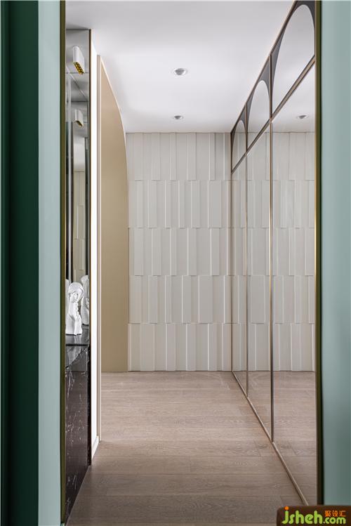 推門入戶,裝修設(shè)計(jì)利用墻面乳膠漆分色和地面材質(zhì)的切換分隔空間,弱化門廳的狹長(zhǎng)感. 迎面白色凹凸護(hù)墻,突顯層次質(zhì)感. 金屬邊框、銀鏡與黑鏡組合,彰顯復(fù)古感的同時(shí)延伸了空間,滿足了入戶全身鏡的需求.