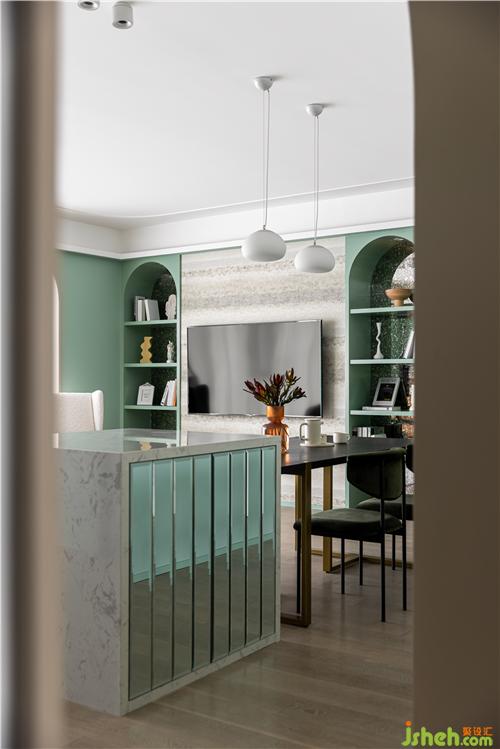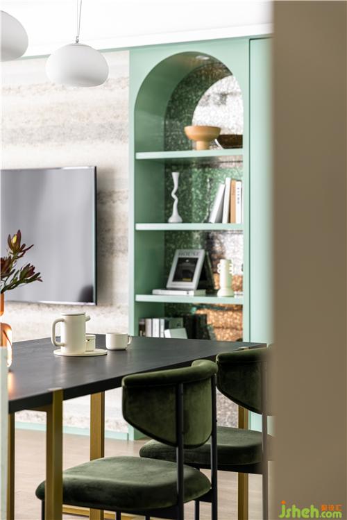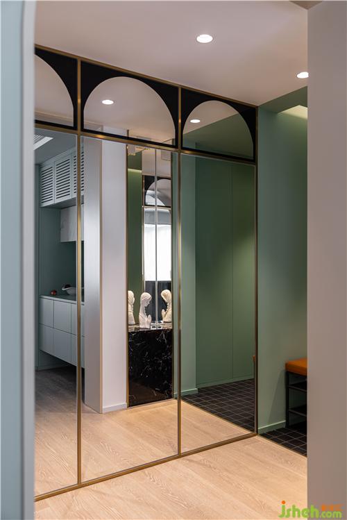 鞋柜綠色烤漆門板,與墻面乳膠漆同色. 鞋柜設(shè)置開放柜,掛衣物包包、存放小物品、臨時(shí)鞋子收納,功能齊全.