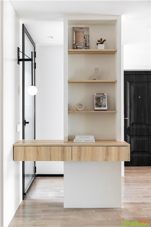 定制半開放餐邊柜,作為廚房和餐廳的過渡與連接,白色與原木色搭配,整體呈現(xiàn)自然凈透的空間質(zhì)感.