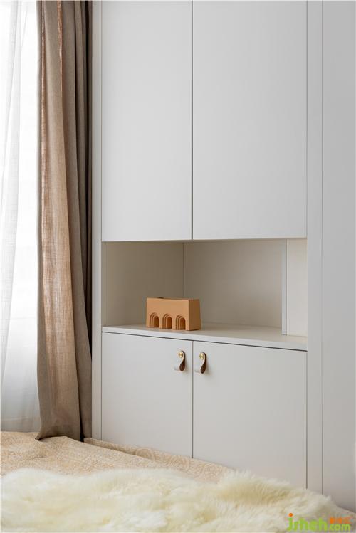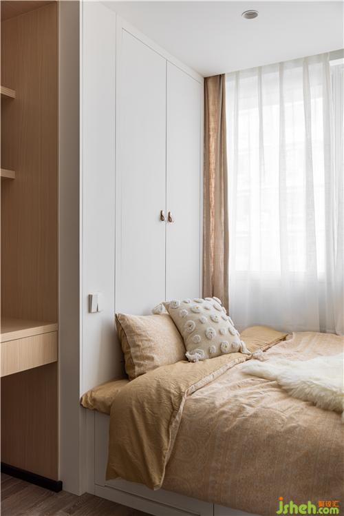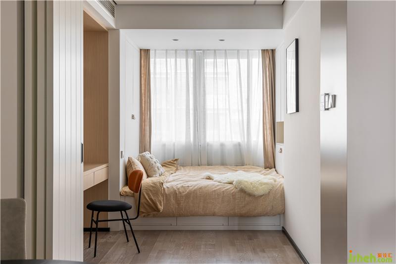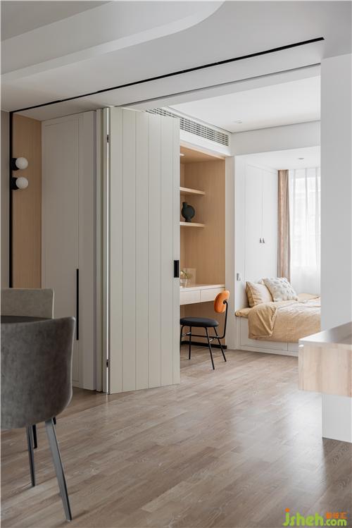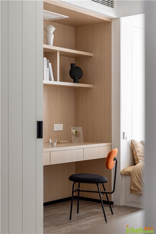 客臥取消實體墻,與餐廳采用實木折疊門連接,為餐廳引入光線的同時擴(kuò)大餐廳視野. 客臥同時具備書房的功能,可開放可獨立,靈活多變南京裝修設(shè)計.