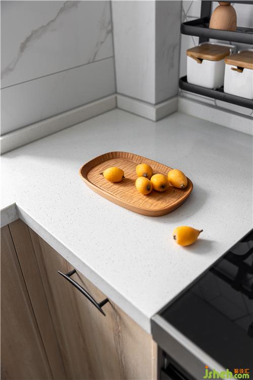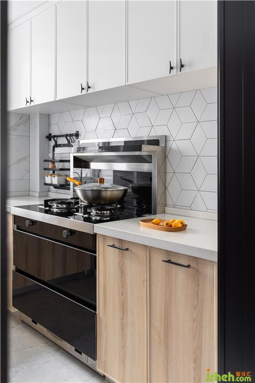 廚房整體設(shè)計(jì)以簡(jiǎn)潔實(shí)用為主,白色吊柜與木色地柜的柜門形式統(tǒng)一,墻面白色六角幾何花磚,為空間增添幾分趣味.