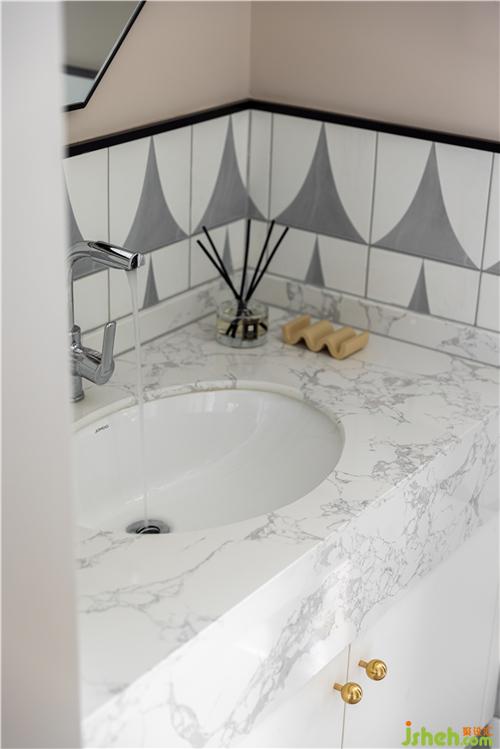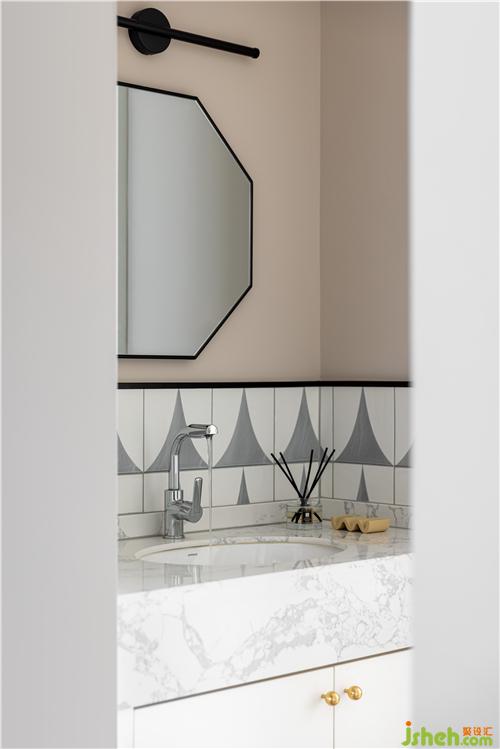 干區(qū)半墻幾何手工花磚秩序排布,八邊形黑框銀鏡、極簡(jiǎn)壁燈、黑色金屬線條,理性直線與溫潤(rùn)奶茶色碰撞,靜謐又柔和南京裝修設(shè)計(jì).