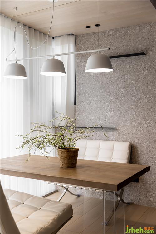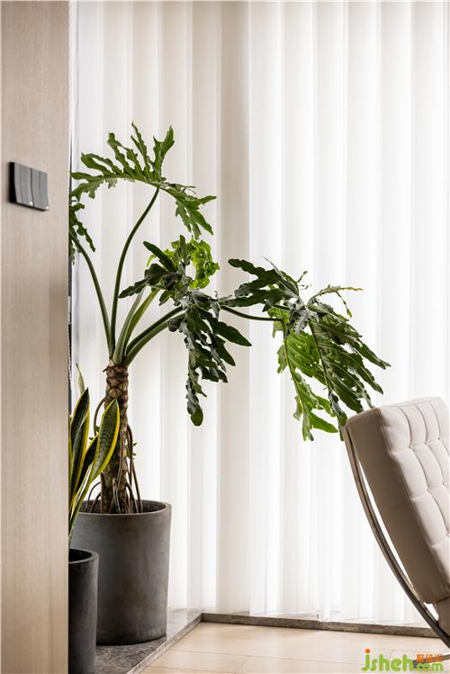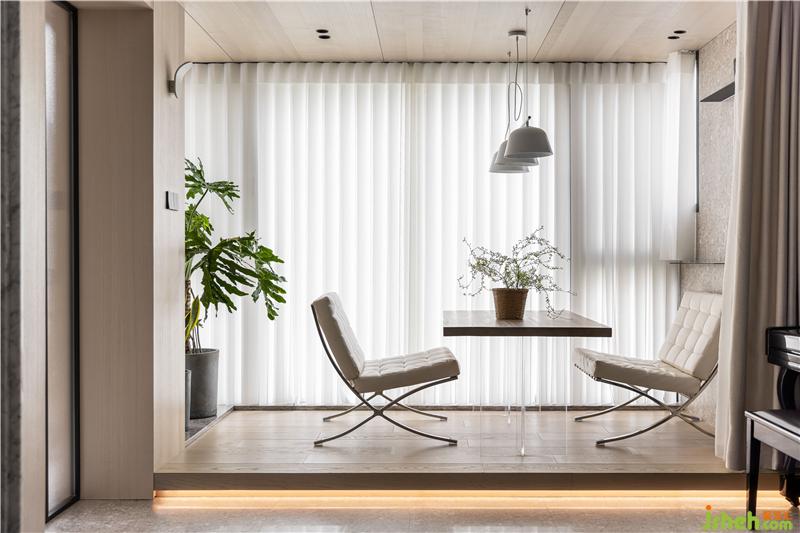 晨曦或午后,光線從白色夢幻簾穿透到室內,暖色木飾面在燈光的映襯下為空間增添溫度,休閑沙發(fā)桌椅組合的配置,豐富了休閑陽臺的功能.