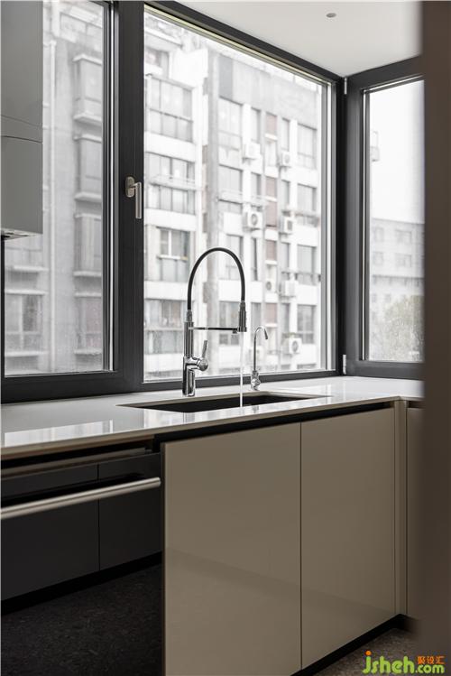 黑色大理石紋理鋪陳打底,開闊的視野窗口,讓光線無限的覆蓋整個廚房空間,亮面烤漆門板簡潔大方,營造整體而統(tǒng)一的視覺性,升降式灶臺很好的解決窗口遮擋問題.