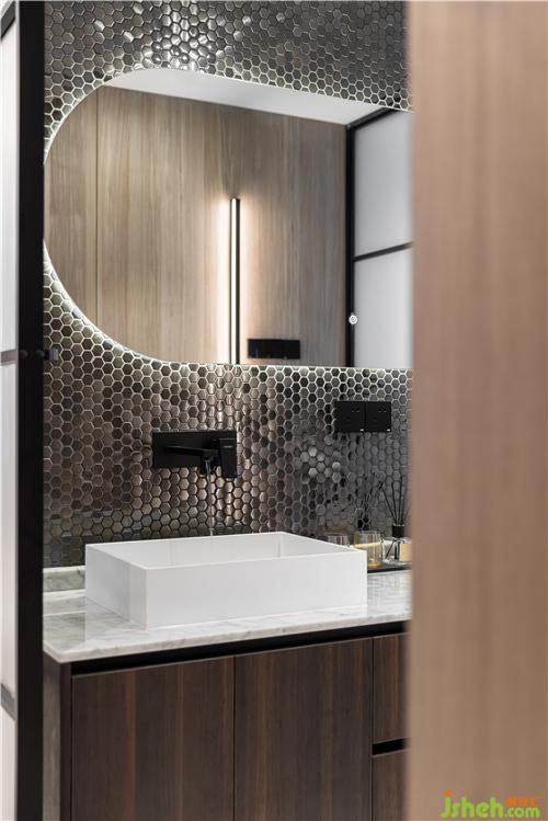 金屬馬賽克背景墻,現(xiàn)代感十足,雙臺盆的設(shè)計滿足了一家四口的需求,大面弧型鏡面讓空間瞬間清亮起來,泰州裝修設(shè)計墻排龍頭、線性下水、臺上盆,每個細(xì)節(jié)都體現(xiàn)了屋主對生活精致度的追求.