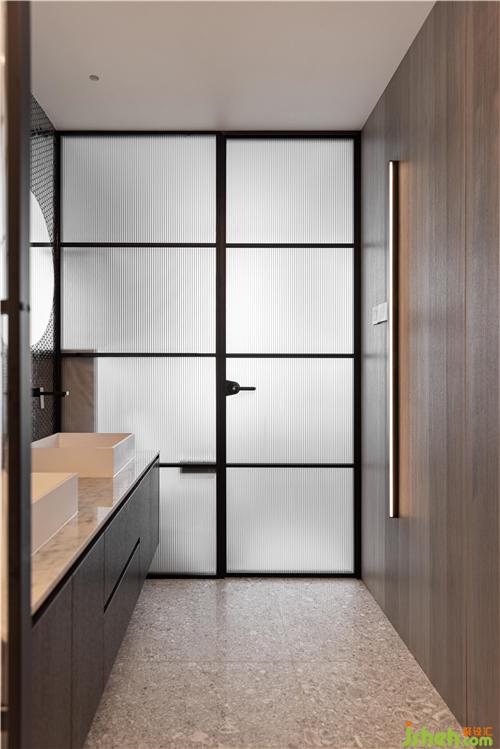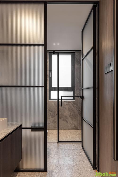 地磚整體跟貼進去,取消了門檻石,淋浴房也取消了擋水條,做了下陷設(shè)計,黑色門框的勾勒增加了利落的現(xiàn)代感.