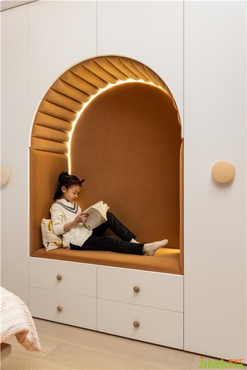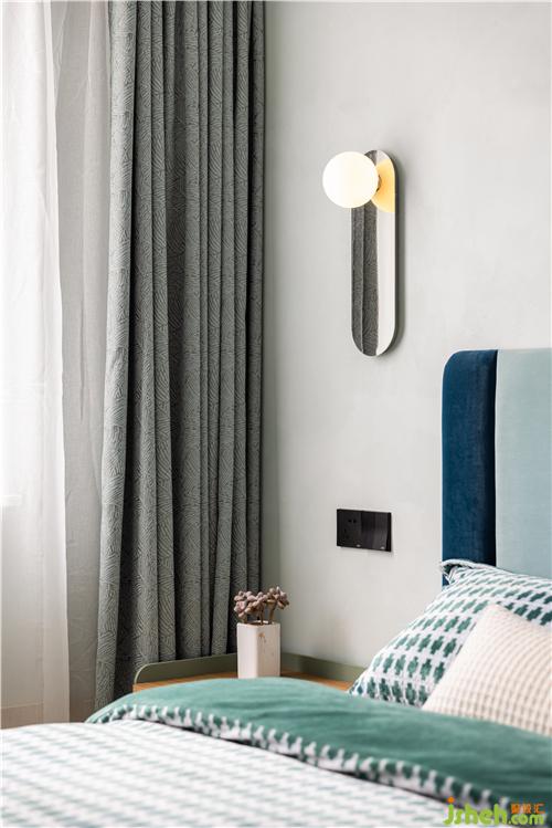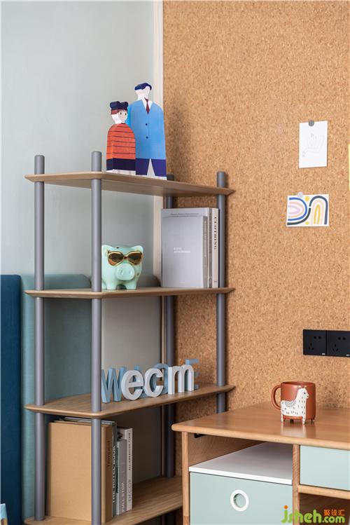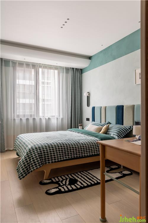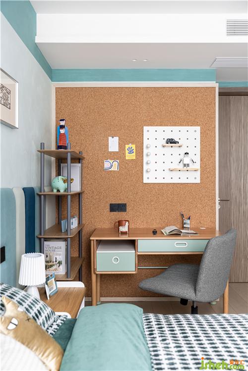 藍(lán)綠色調(diào)是男孩房的主調(diào),三種顏色寬窄不一的床頭軟包有序的排列,布局與女孩房鏡像,泰州裝修設(shè)計(jì)書桌和椅子現(xiàn)代美觀,跟女孩房也是同款不同色,讓姐弟倆的房間有著相同的符號(hào).