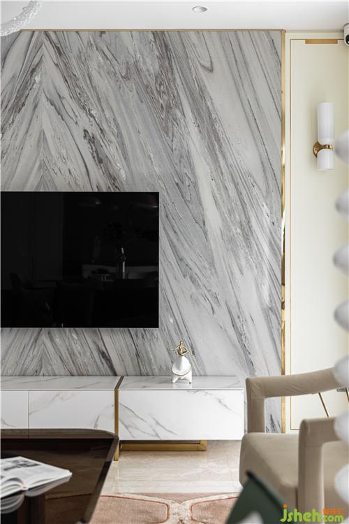 客餐廳是一個(gè)整體的橫廳空間,客廳區(qū)域的電視背景用石材代替原來(lái)的柵格設(shè)計(jì),與金屬走邊的護(hù)墻拼接來(lái)彰顯空間的層次感. V型的石材紋理也更具沖擊力,南京室內(nèi)設(shè)計(jì)師吸引眼球. 墨綠色的沙發(fā)搭配黑色玻璃茶幾沉穩(wěn)大氣,中和空間的清冷氣質(zhì),達(dá)到審美平衡.