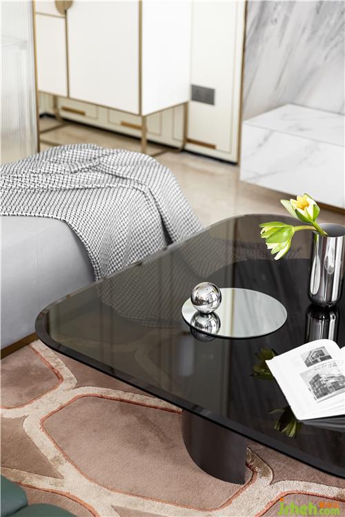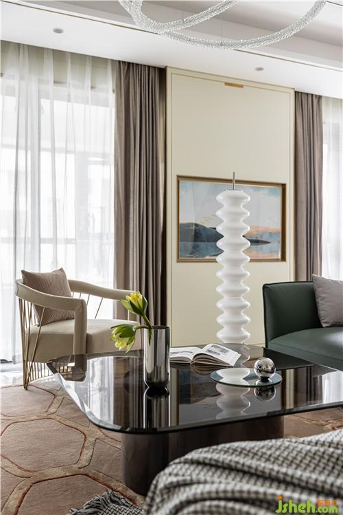 映入眼簾的弧形金屬隔斷,搭配透明的長(zhǎng)虹玻璃,奠定了整個(gè)家溫暖精致的基調(diào). 透明的亞克力玄關(guān)桌通透又有儀式感,入戶的美可以消除一天的疲憊.