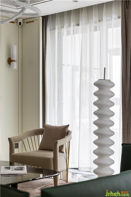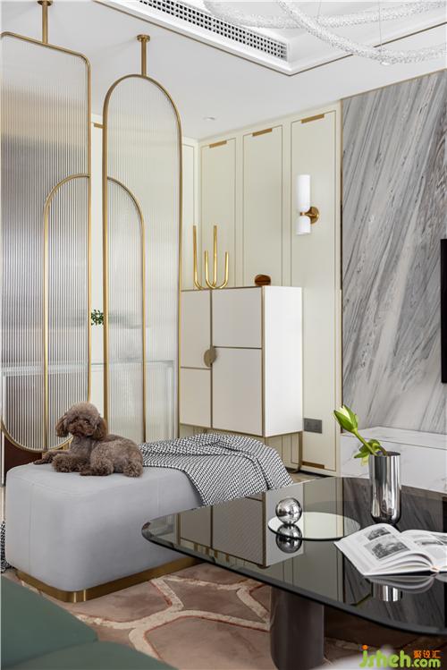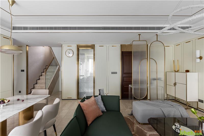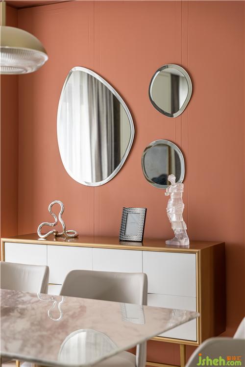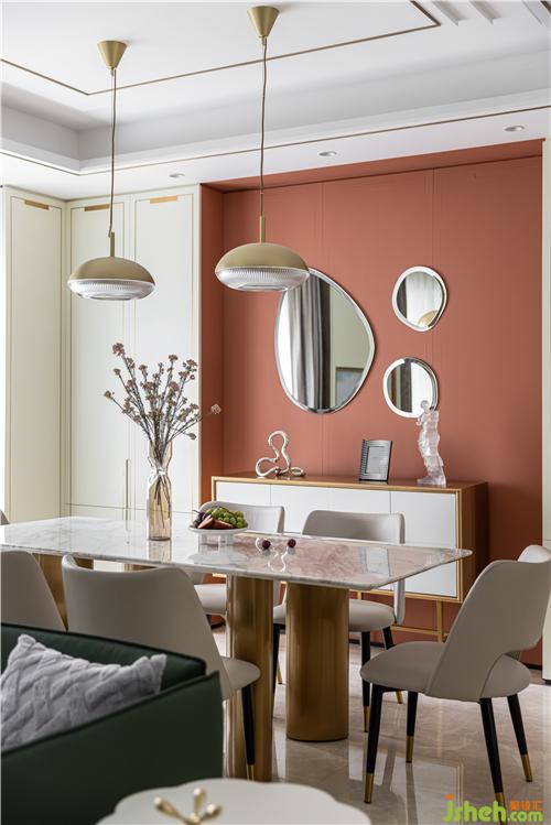維持了原有的格局,餐邊柜區(qū)域用獨(dú)特的西柚色系作為點(diǎn)綴,鏡面裝飾無形中延伸視野,加上松茸造型的垂感吊燈,讓空間更具輕奢、精致的氛圍.