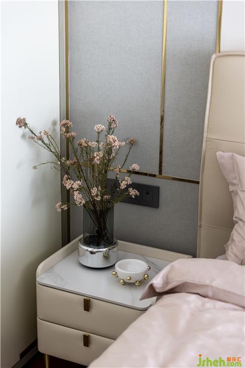 大量運用弧形元素,吊頂?shù)牟ɡ思y膏線條、墻面上下波浪形裝飾以及帶有波浪紋的五斗柜,營造統(tǒng)一而精致的細節(jié).