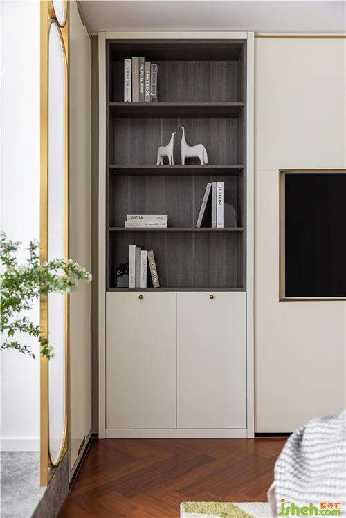 原來通向衛(wèi)生間的門被設計成展示區(qū),電視背景的石材元素沿用至此,契合整體布局,優(yōu)雅、精致豐富著空間情緒.