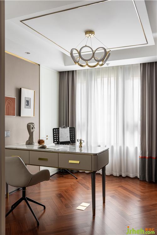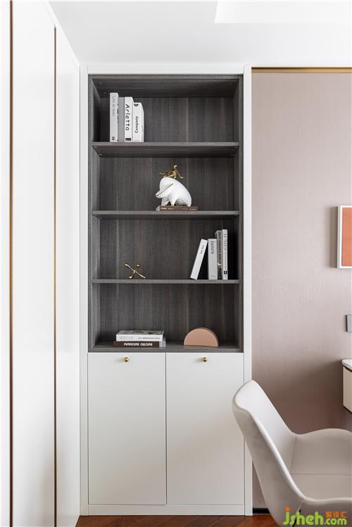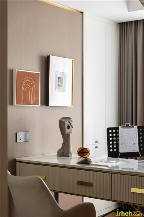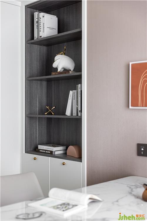 石材面的書桌彰顯肌理感,墻上個性的立體裝飾畫打破壁紙的單一性,沒有特別跳躍突出的元素,但卻處處充盈著恬靜氣息. 書柜則是實用性的體現(xiàn),收納美觀,一氣呵成.