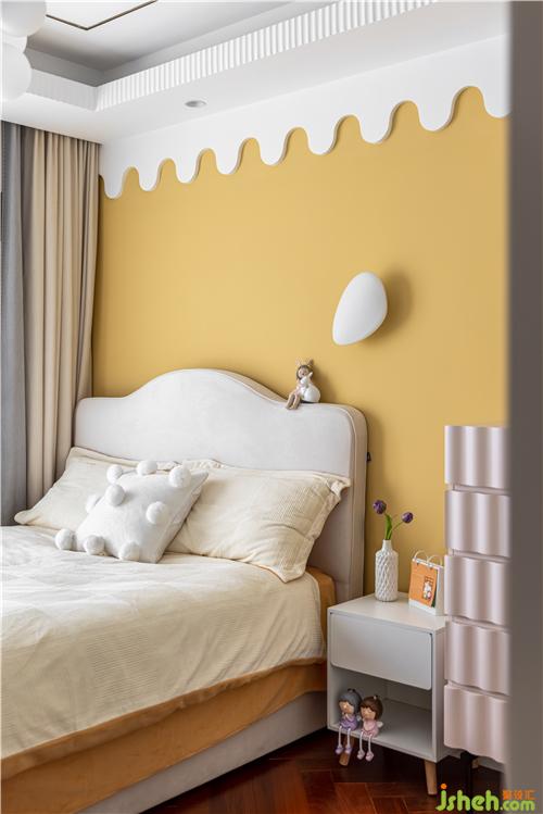 空間整體通透明亮,明黃色乳膠漆搭配白色波浪形墻面裝飾賦予空間溫暖、俏皮的氛圍感. 大面積簡潔的灰白色調(diào),點綴高飽和度家具,讓空間生動起來.