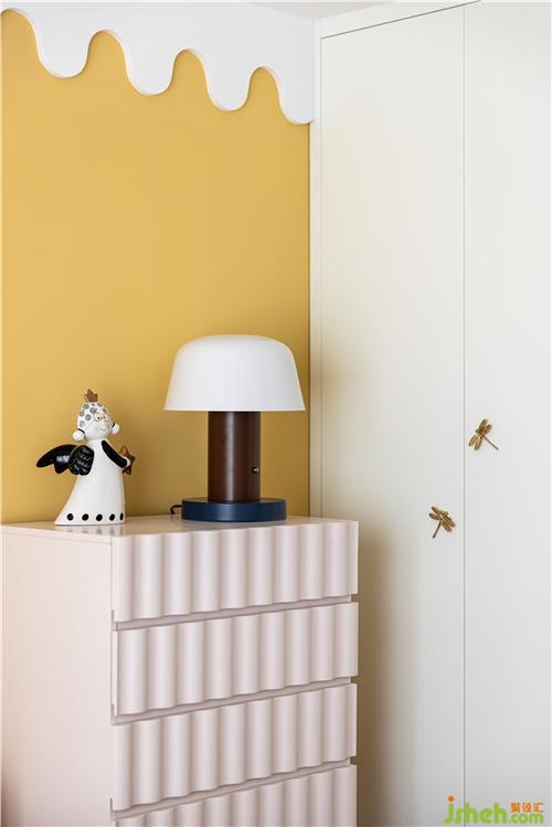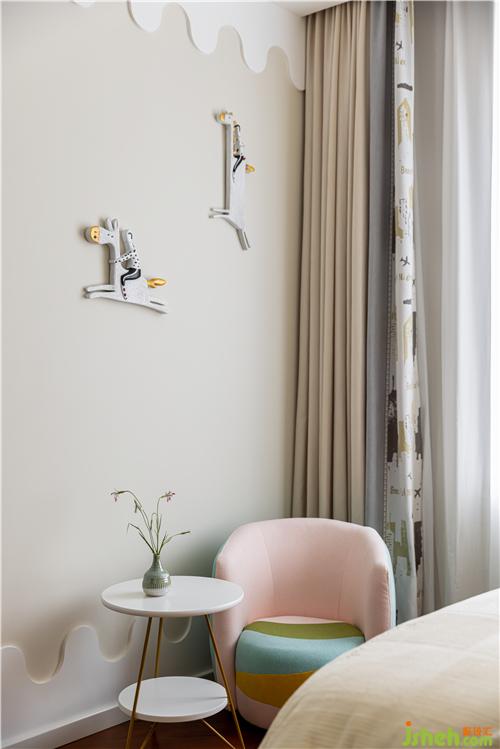 采光井被打通納入室內(nèi),利用地臺(tái)抬高兩步劃分區(qū)域,消防管道藏匿于柜體之中,這一方小天地打造成女兒的玩??臻g.