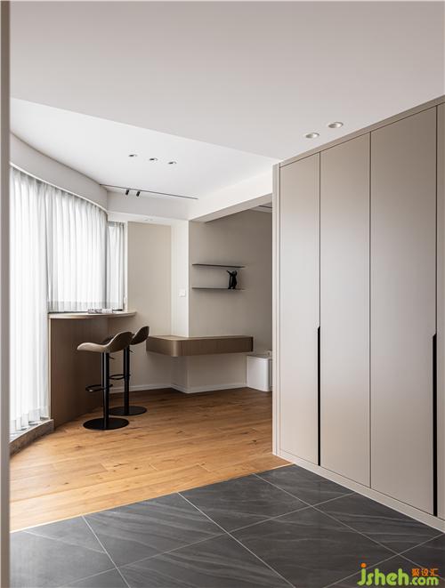 整面儲(chǔ)物柜為門廳預(yù)留出足夠的儲(chǔ)物空間,理性線條與弧形曲面碰撞的造型卡座,靜謐沉穩(wěn),與其背后一幾窗洞內(nèi)的煙火氣形成鮮明對(duì)比,增加了空間的趣味性與互動(dòng)感.