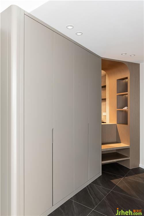 純凈白色中糅合灰色與原木色,營(yíng)造出輕松自然的居住氛圍,大面積的定制柜組合,兩側(cè)排布,滿足了收納上的需求,同時(shí)也節(jié)省了整體的空間,更加的簡(jiǎn)潔.