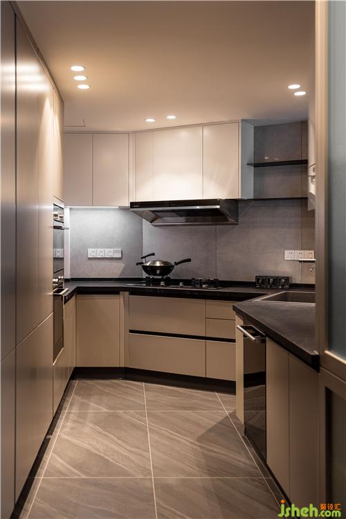 灰色柜門與黑色的操作臺(tái),形成了顏色上的對(duì)比,打造出了空間的深邃與高級(jí)感,豐富了廚房空間的層次感.