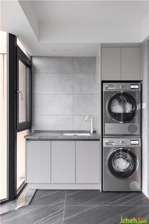 陽臺定制洗衣池,洗衣機干衣機上下疊放,空間整潔利落,沿用廚房與門廳地面同款地磚,色系統(tǒng)一.