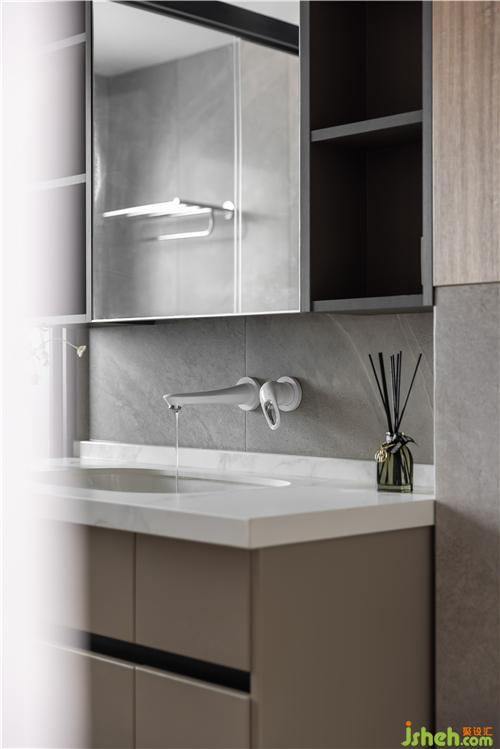 主衛(wèi)打破傳統(tǒng)布置方式,臺盆內置,如廁區(qū)與淋浴區(qū)分開,避免細菌滋生. 鏡柜結合開放架形式,方便日常洗漱用品放置,同時利用壁掛馬桶的墻體構造,增加儲物空間.