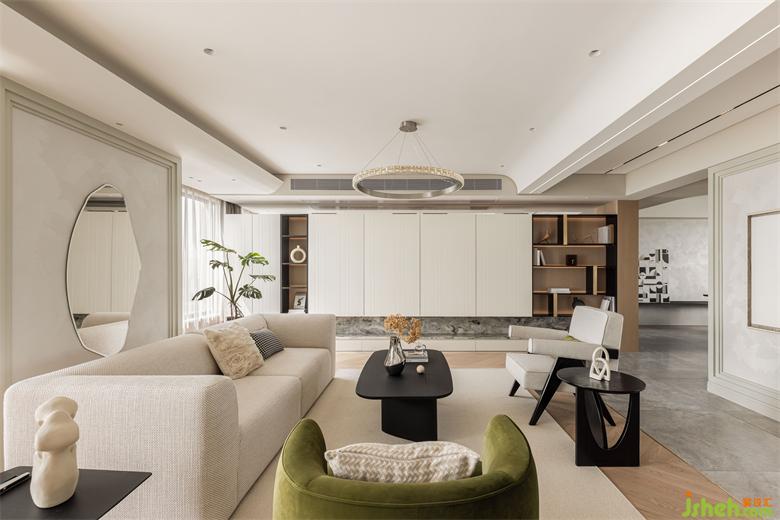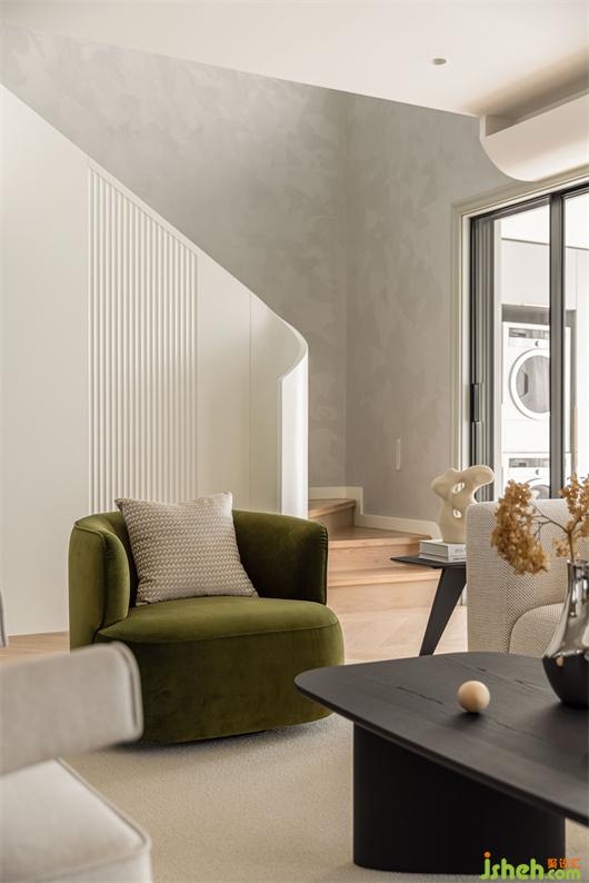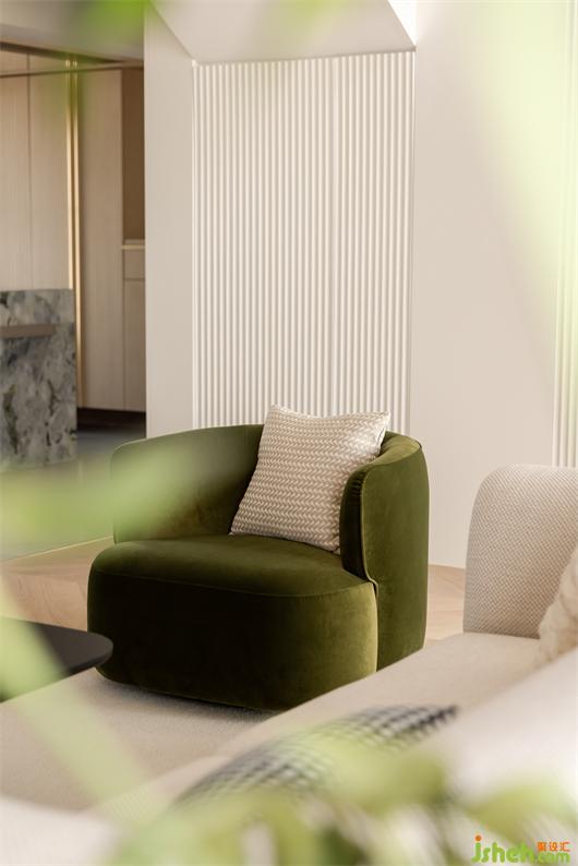 客廳以極簡的設(shè)計手法,打造出一個溫暖靜謐的質(zhì)感空間,輕盈視感的家具單品,圍合出舒適的起居中心,橄欖綠的絲絨沙發(fā)調(diào)和了空間的層次,空間的每一處都盡顯溫柔治愈,去掉不必要的繁雜細節(jié)和線條,呈現(xiàn)了一個自然純粹美好的居家環(huán)境。