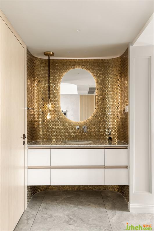 金色馬賽克的整面內(nèi)弧形背景墻與圓弧發(fā)光鏡的融合,將肌理、燈光、質(zhì)感等元素融合在一起,花漾美作營(yíng)造出精致到恰到好處的氛圍感空間。