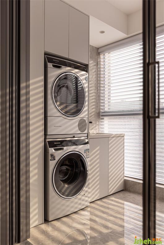 灰色系石紋大磚通鋪,簡潔大氣。同色系收納柜搭配相得益彰,陽光穿透百葉簾,灑在地面,描繪溫暖的生活場景。