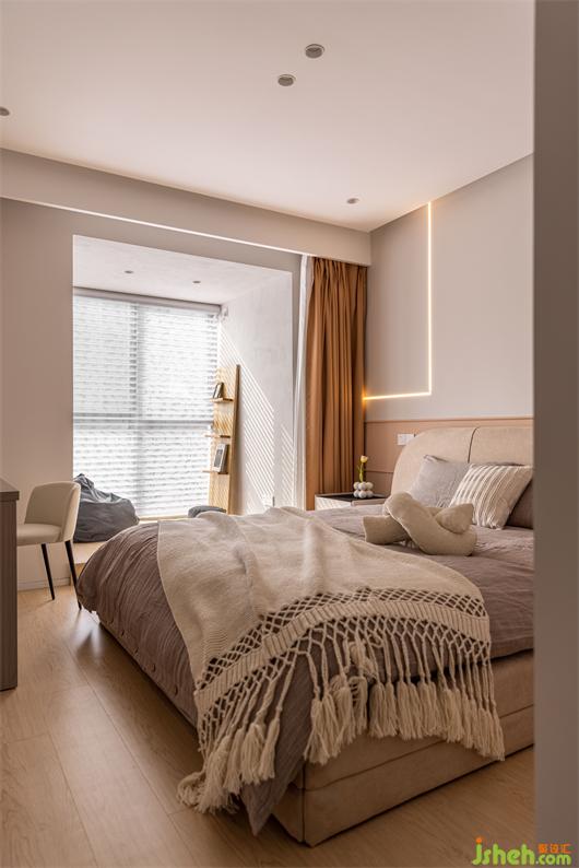 南京家裝設(shè)計(jì)背景墻分色處理,暖灰和粉橙色碰撞。利落的線性燈與簡約的石膏線條通過縱橫交錯(cuò)的重疊手法進(jìn)行演繹,提升格調(diào)展現(xiàn)氣質(zhì)的同時(shí)在視覺上形成錯(cuò)位感,空間顯得更加輕盈。衣柜轉(zhuǎn)角處的風(fēng)格延伸更是增加了空間的整體性。