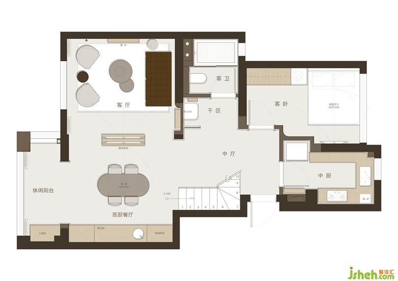 4. 將原來的客廳空間改成餐廳,并將西廚功能納入餐邊區(qū)
